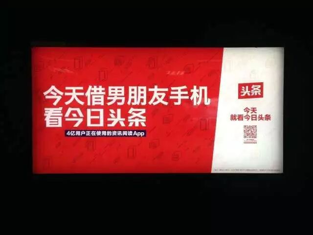 今日头条铺天盖地的广告牌也曾在短时间内抢占了大家的视线,不管走到哪儿,满脑子都是他们的红白配:“今天心情好,看今日头条”、“今天吃饱了撑的,看今日头条”、“今天来大姨夫,看今日头条”......总有一句能和你的当下状态匹配。