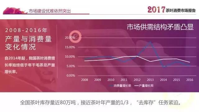 我们不妨一起来回顾一下2017年度茶叶市场发展概况。据了解,中国已成为全球最大的产茶国和茶叶消费市场,预计2017年全国茶园面积4400多万亩,比2016年增加130万亩;全年干毛茶产量258万吨,比2016年增加17万吨。抛开茶叶出口、国内消费、深加工等茶叶消耗后,2016年全国茶叶存量达60万吨,2017年预计库存量近80万吨。我国茶叶生产增速仍高于消费与出口,总体呈现出产能过剩的格局。