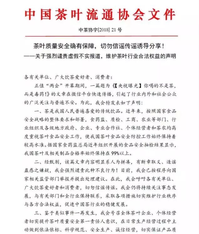 据了解,在中国茶叶流通协会发布的中茶协字【2018】22号文件中,通报了此次事件发展情况。系“洞察时政等微信公众号刊登了题为《【央视曝光】你喝的不是茶,而是毒药!》等信息,在标题中对茶叶质量安全进行恶意诱导。信息发布后,在茶叶界及广大消费者中引起高度关注及普遍不安。”