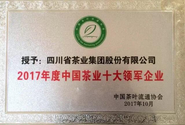 在第十三届中国茶业经济年会上,中国茶叶流通协会公布了2017年中国茶叶行业调查结果,川茶集团荣获2017年度“中国茶业十大领军企业”和2017年度“中国茶叶行业综合实力百强企业”荣誉称号,这是川茶集团连续两年获此两项殊荣。