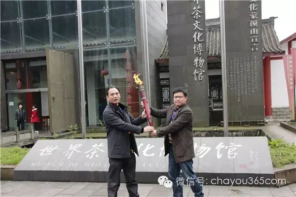 活动现场,国际茶业科学文化研究会副会长于观亭、中国茶叶博物馆馆长王建荣、中国国际茶文化研究会副会长孙前、南京农业大学教授朱自振、四川省茶叶流通协会秘书长陈书谦共同点燃火炬,茶火炬由雅安市副市长徐旭,雅安市名山区副书记、代理区长余力等进行传递,这预示着蒙顶山茶将荣登2015年意大利米兰世博会,为全世界人民献上一杯清香感恩的蒙顶山茶。