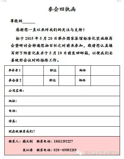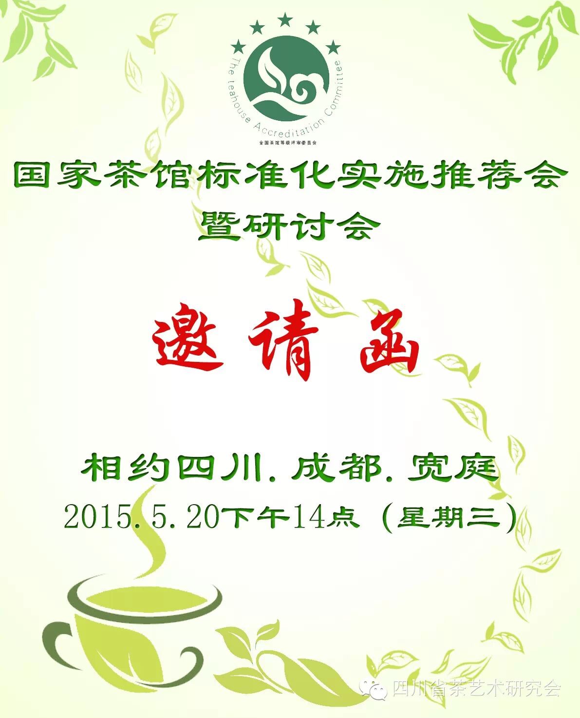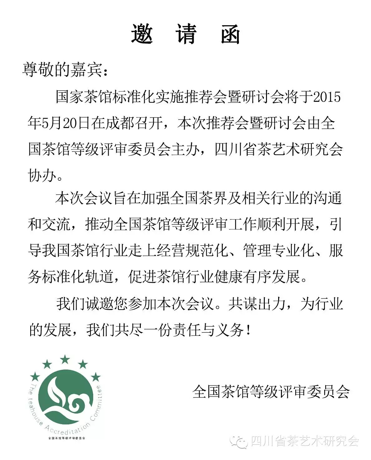 诚邀您参加国家茶馆标准化实施推荐会暨研讨会。谨定于2015年5月20日下午14:00在成都市宽庭茶文化主题餐厅举行,敬请您认真填写参会回执函并于5月19日前发至邮箱ydan614@126.com,以便我们妥善做好会议时的接待工作。