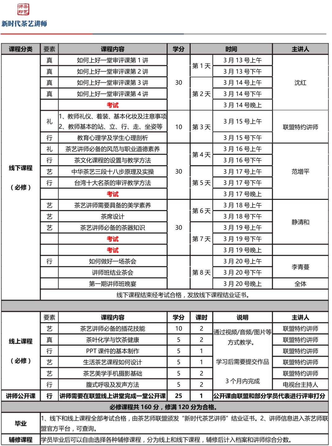 表格中为新时代茶艺讲师必修课程