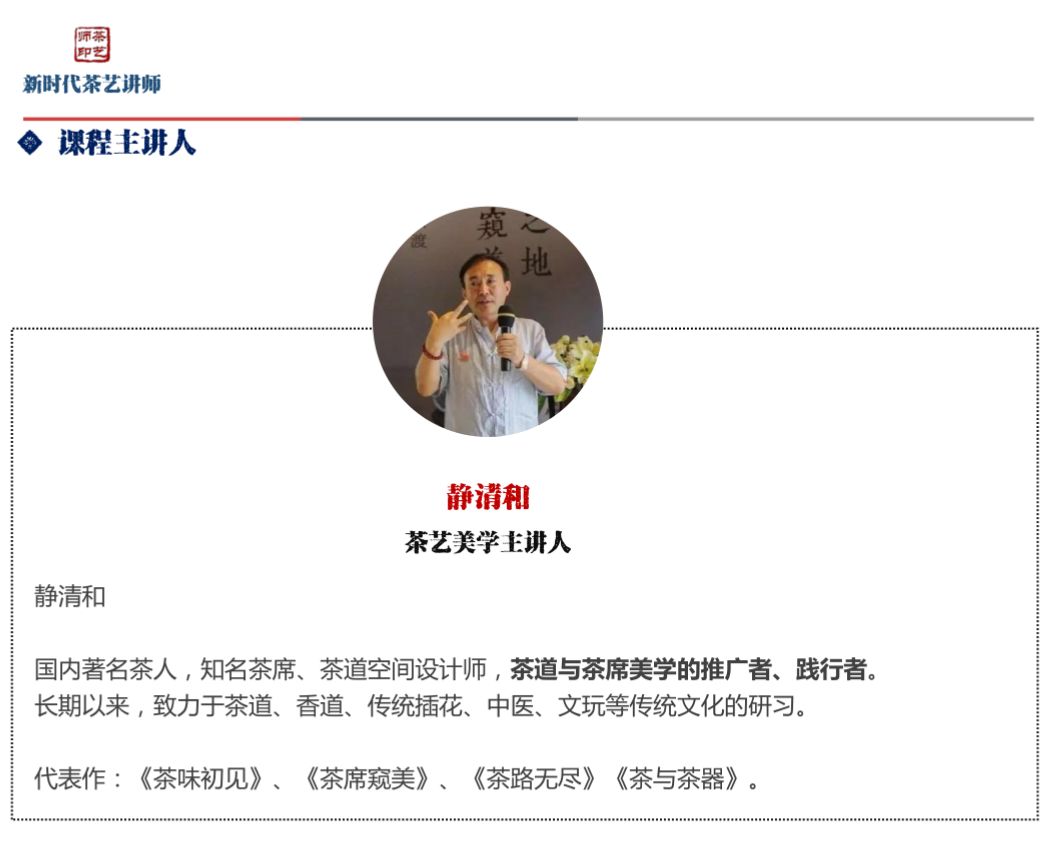 静清和老师将通过两天时间教你一个茶艺讲师应该具备的美学素养和如何进行茶席设计。