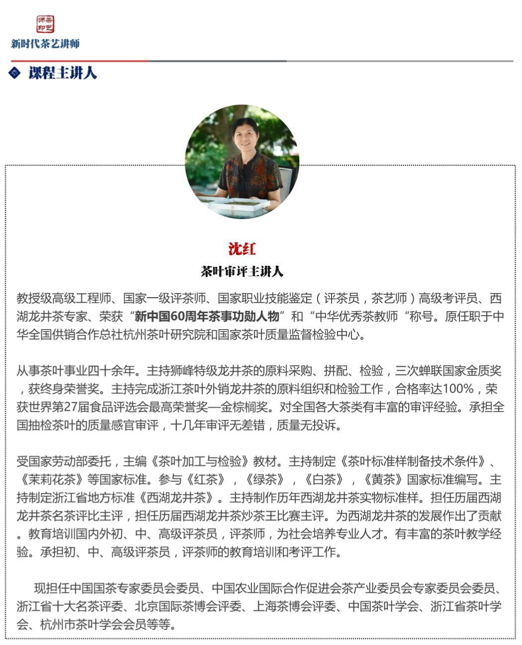 万变不离其宗,茶是茶艺和茶文化的根基。茶艺讲师要具备茶叶审评能力和如何上好一节茶叶审评课的专业能力。为此,我们为你找来具有几十年审评经验和教学经验曾获得新中国60周年茶事功勋人物奖的沈红老师。