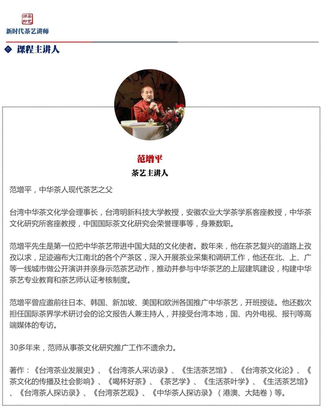茶艺讲师礼为根基,茶艺也是根本。我们为你请来中华现代茶艺之父范增平先生为你讲授茶艺讲师的礼仪、茶人的素养以及文化课程的教学方法和中华三段十八步的茶艺实际操作。