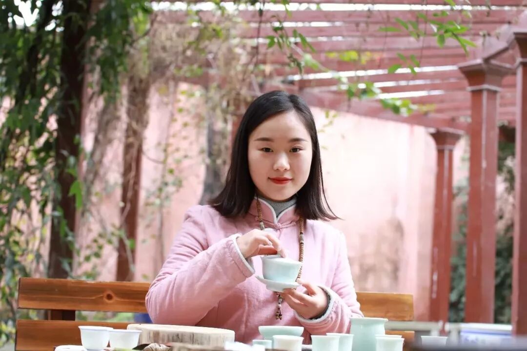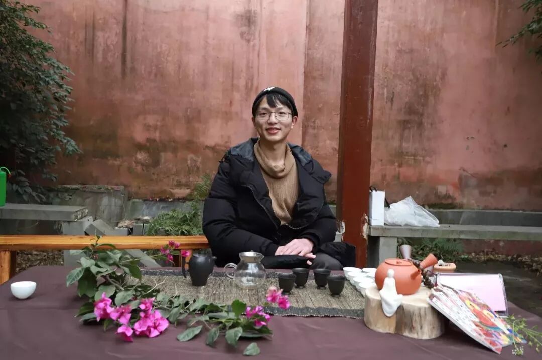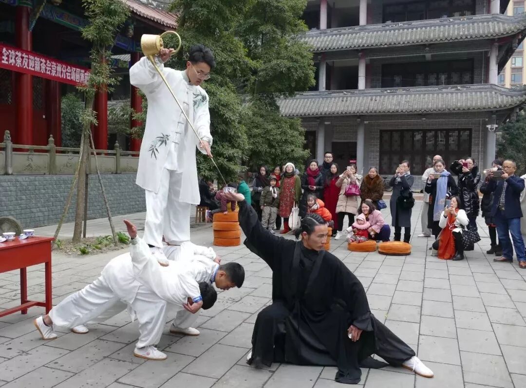 ▲都江堰问道茶社同学表演青城长嘴壶茶艺