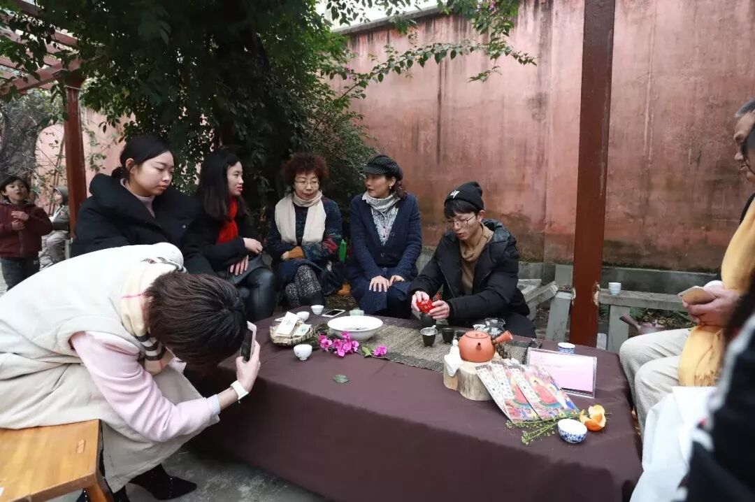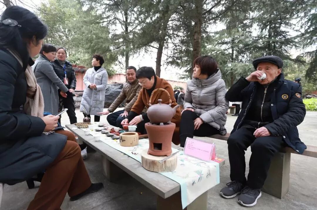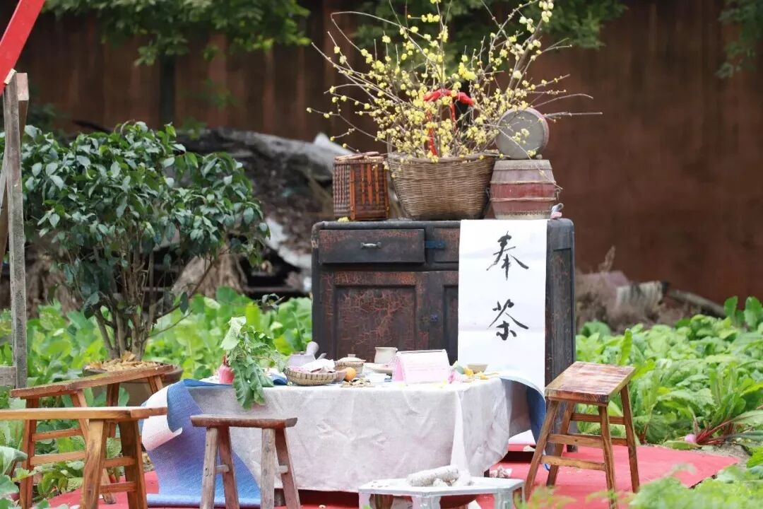 踏雪寻梅,返璞归真。在茶席布局上,2018《茶道》茗读会再度创新,从整齐划一的矩阵式分布,改变为错落有致的分散式布局。十多个茶席分别设置于小广场、小树林、小菜园、小凉亭等位置,或长桌、或圆桌,高低不同,更体现“回归自然”、“放低姿态”的茶人精神。大家围炉而坐,同品一杯美茗,更有古人品茶的意境——席外老松凛凛、修竹沙沙、寒梅瑟瑟;席内炉火灼灼、香烟袅袅、茶味浓浓。二者相互应合,这种境界很古典,很儒雅,也很温情。
