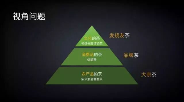 在中国人的生活当中,有三个茶:柴米油盐酱醋茶、烟酒茶、琴棋书画诗酒茶。这三个茶是不同的,最底下这个(柴米油盐酱醋茶)是农产品的茶,中间(烟酒茶)是消费品的茶,再上面这个(琴棋书画诗酒茶)是文化的茶。事实上,从市场和品牌的角度来看,可能消费品的茶更像品牌茶,而农产品的茶是大宗茶,文化的茶变成了发烧友级的茶。