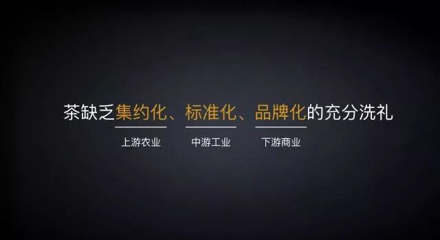 由于消费者对茶叶认知的不足和市场茶叶价格的混乱,是茶产业的两大痛点。因此,品牌应该用自己的专业能力告诉消费者真相。总结下来就是,茶企需要集约化、标准化、品牌化的充分洗礼;集约化在上游,进行规范化种植,中游是进行标准化的生产,下游则是品牌创建。