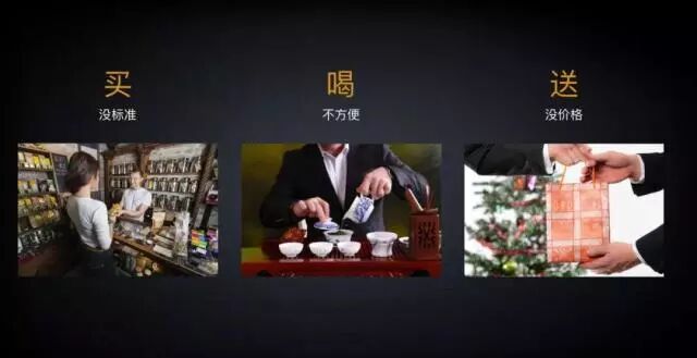 针对茶叶的消费场景,无非是:买、喝、送。「没有标准」是买的时候最大的困惑。买的时候很困惑,喝的时候不方便,送的时候不清晰。到了茶城和茶叶市场,五花八门的价格、参差不齐的品质,也不知道哪个更适合自己;当你对礼品做品牌选择的时候,它们大多数都没有清晰的价格标签。所以我们说这三个场景实际上存在三个痛点。